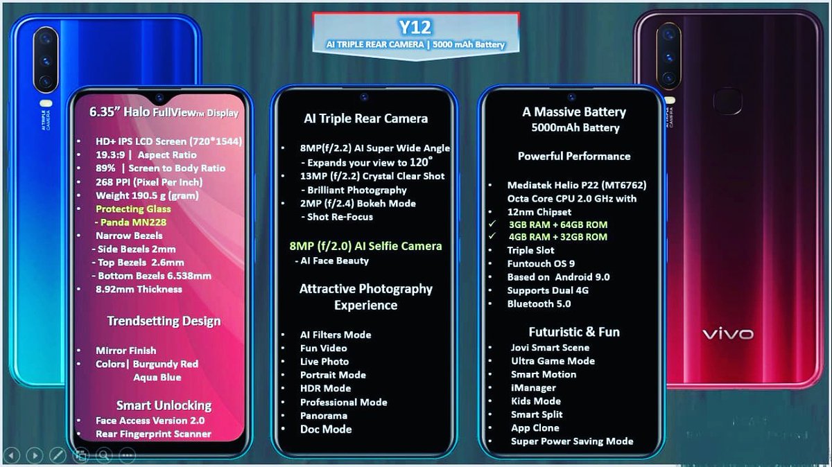 The Vivo Y12 and Vivo Y15 (2019) will likewise apparently pack a unique finger impression sensor, double 4G backing, and Bluetooth 5.0. The telephones will be offered in Burgundy Red and Aqua Blue hues.